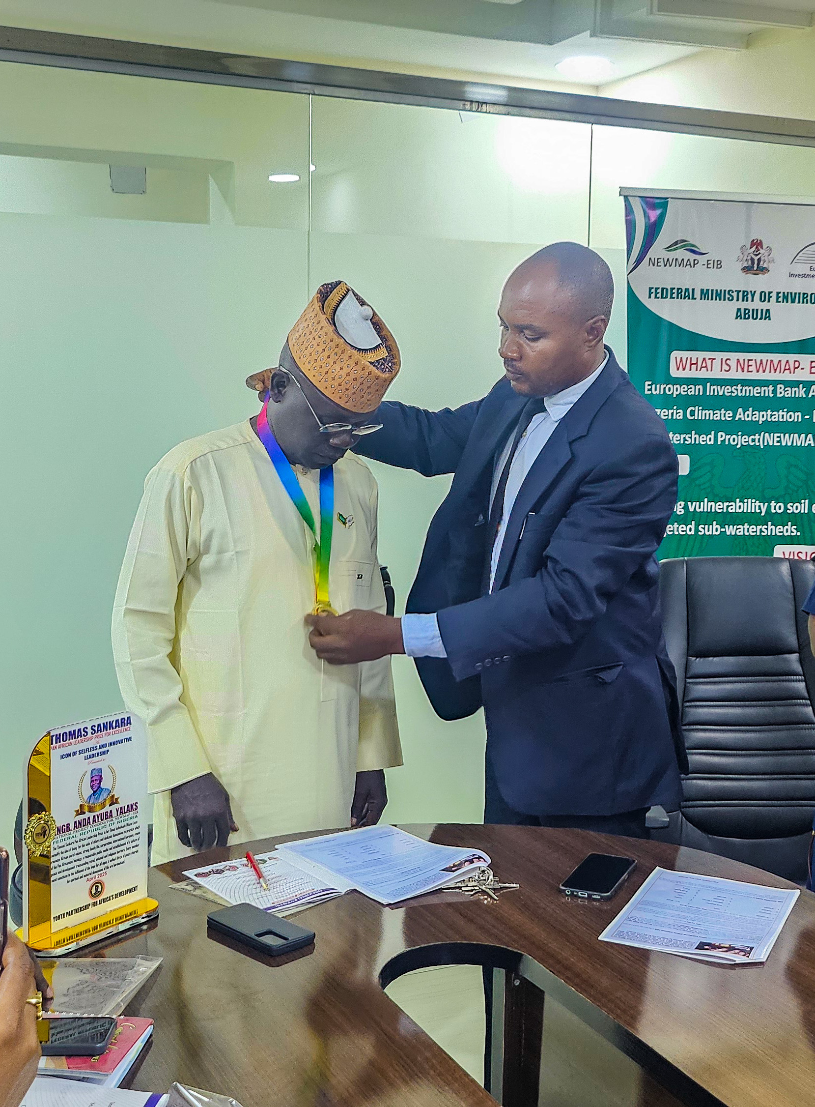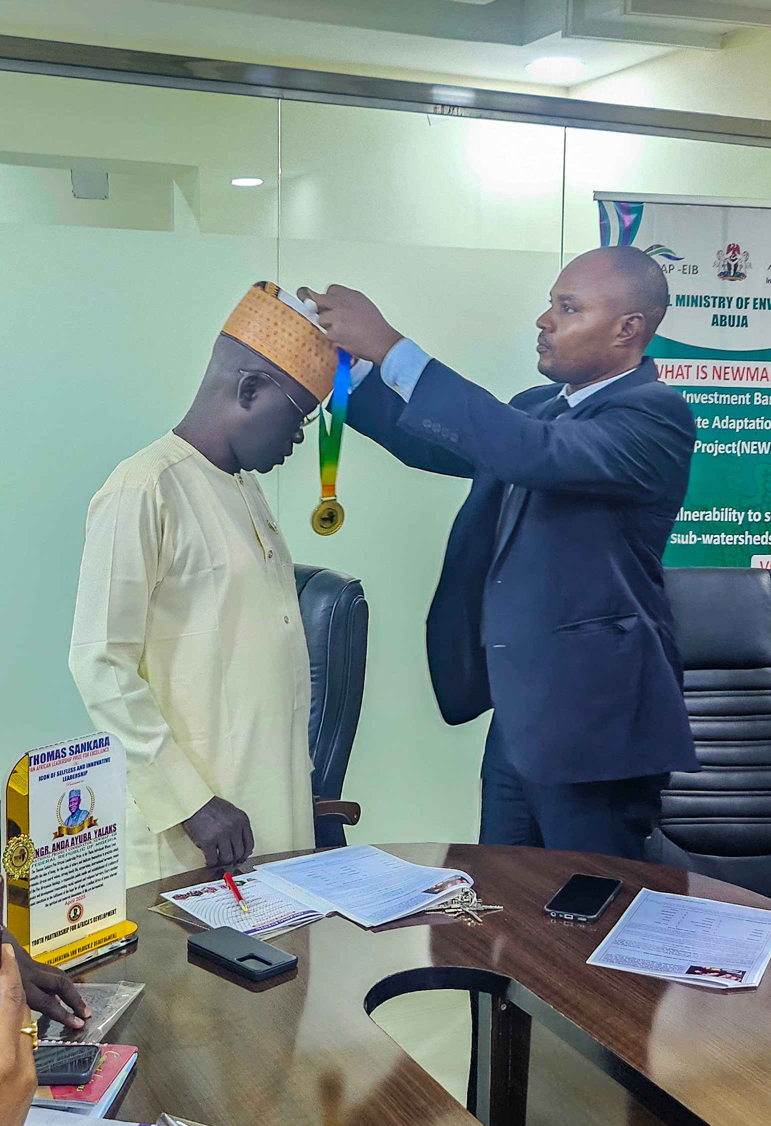 In a landmark recognition for selfless service and innovative leadership in addressing erosion and flood challenges in Nigeria, the National Project Coordinator, Nigeria Climate Adaptation Erosion and Watershed Project NEWMAP-EIB, Engr. Anda Ayuba Yalaks has been awarded the prestigious PAN- AFRICAN selfless Leadership Prize for Excellence which aligns with the ideals of the late revolutionary icon, Thomas Sankara. The award was presented by the Youth Partnership for Africa’s Development (YOUPAD), an African youth organization dedicated to fostering leadership and entrepreneurship across the continent during a courtesy visit to the National Project Coordinator on Tuesday in Abuja .