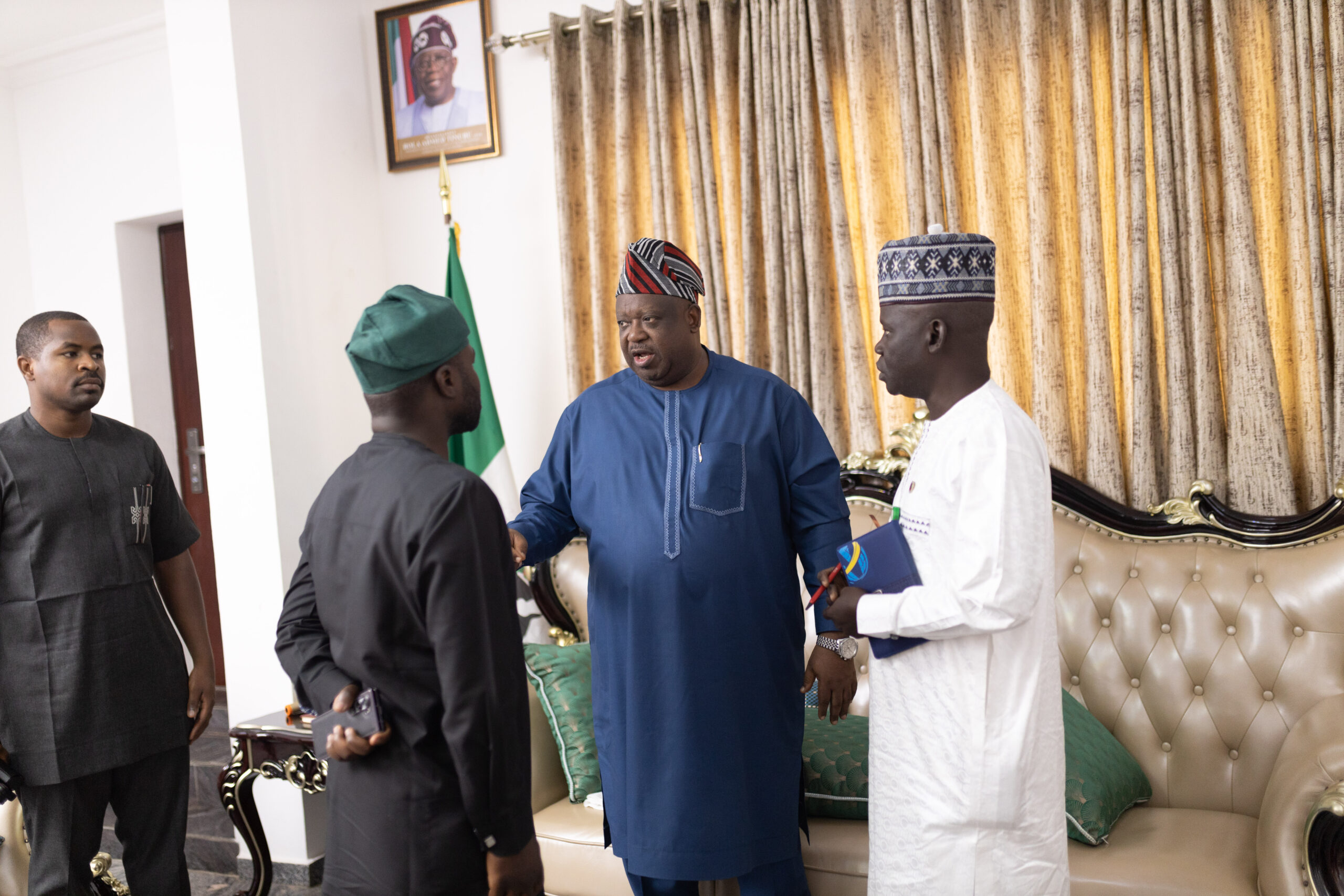The Executive Governor of Plateau State, Bar. Caleb Manasseh Mutfwang (l) and the National Project Coordinator NEWMAP-EIB Engr. Anda Ayuba Yalaks, NIAE, FNAH, FNIWE (r) during the courtesy call to his office